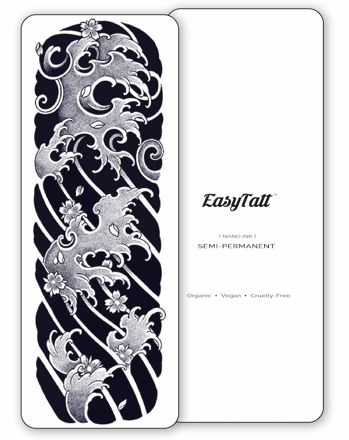 Experience the designer art of a Japanese Waves semi-permanent tattoo. Our premium black inks are intricately blended to create an exquisite, stylized full sleeve pattern. Our unique semi-permanent product ensures an unparalleled level of vibrancy and longevity.