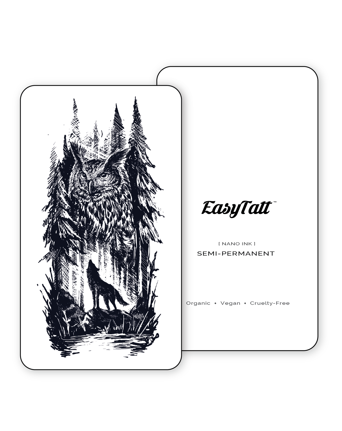 Introducing Night Howl: a beautiful, semi-permanent tattoo showcasing a majestic wolf and owl glimmering amongst the forest. Enjoy the elegant design for weeks, without a single needle. Transform your skin and enhance your look with this stunning artwork.