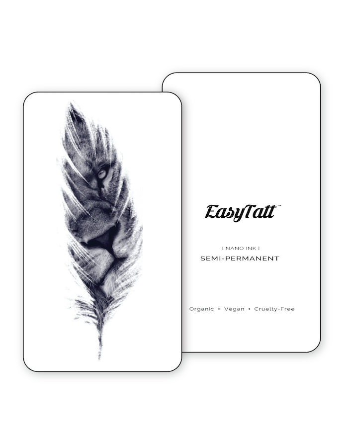 Experience the power of the beast with the Hidden Predator black semi-permanent tattoo. Featuring a lion's face silhouetted through a feather, this unique tattoo will add a dramatic statement to your look. Show off your wild side with a bold and beautiful design that won't fade or wash off. Unleash your inner predator and own the night!