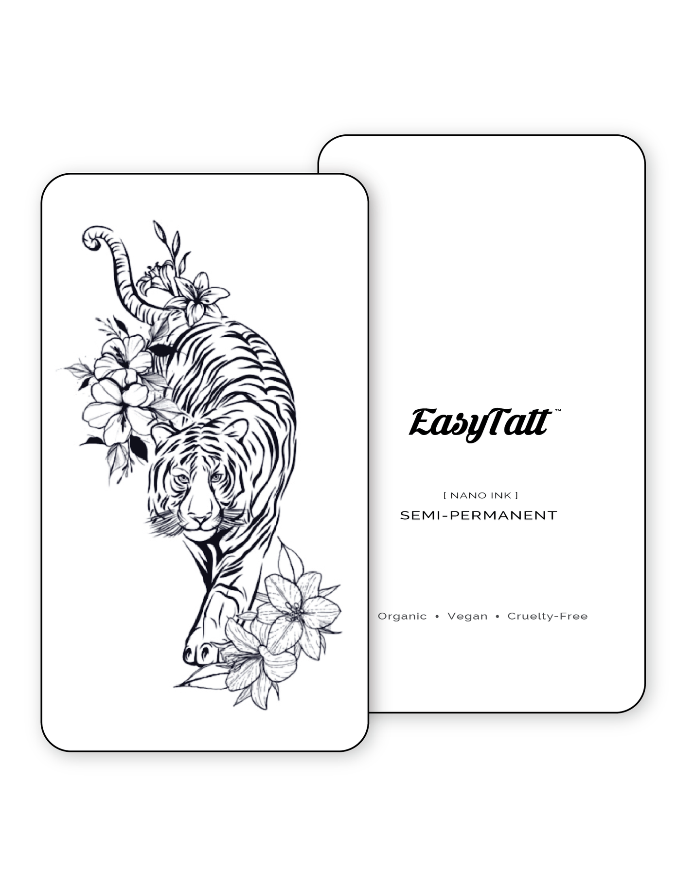 Introducing Habitat - a semi-permanent black tattoo of a tiger in a lush floral jungle. This beautiful piece of art is vibrant, detailed, and perfect for expressing you with style! Make a lasting impression with this stunning tattoo that will stay vibrant for up to two weeks.