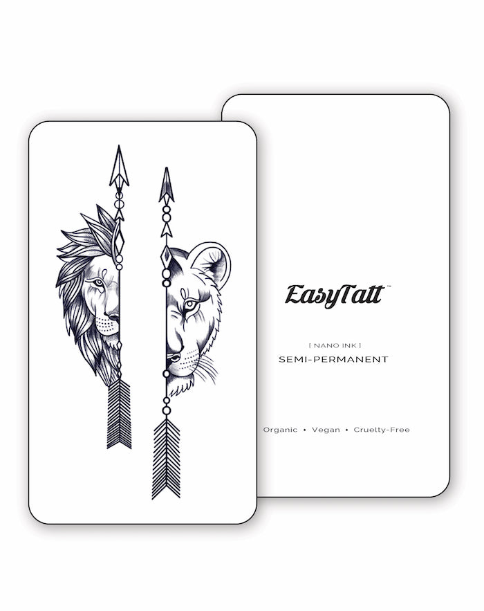 Achieve maximum impact with Pursuit! This unique semi-permanent tattoo features two arrows and lion faces, crafted with attention to detail for a bold statement. Show your strength and take control of your destiny with a Pursuit tattoo!