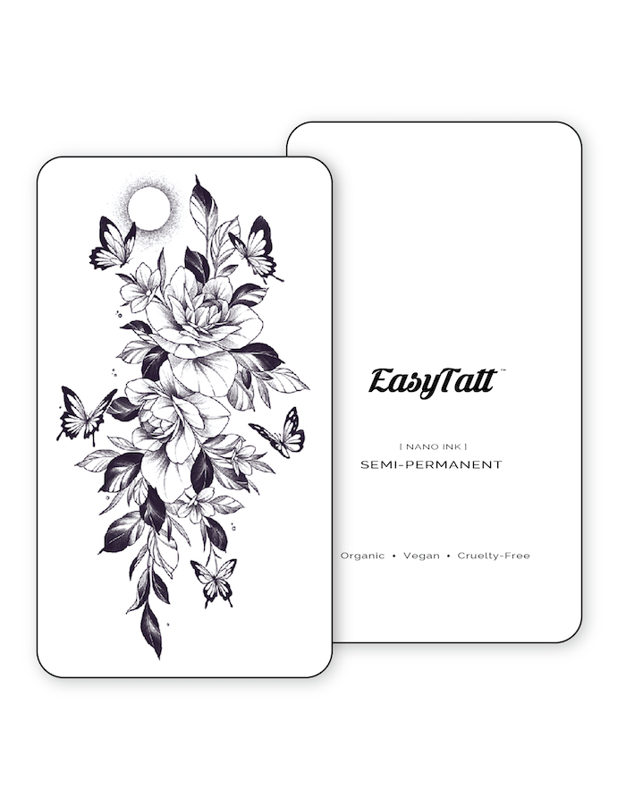 Introducing Flourish—the perfect semi-permanent tattoo for floral fanatics! Enjoy stylish, intricate designs featuring a mix of elegant butterflies and lush blooms in fine black ink. Capture the beauty of nature and add a timeless accent to your look- in a word: flourish!
